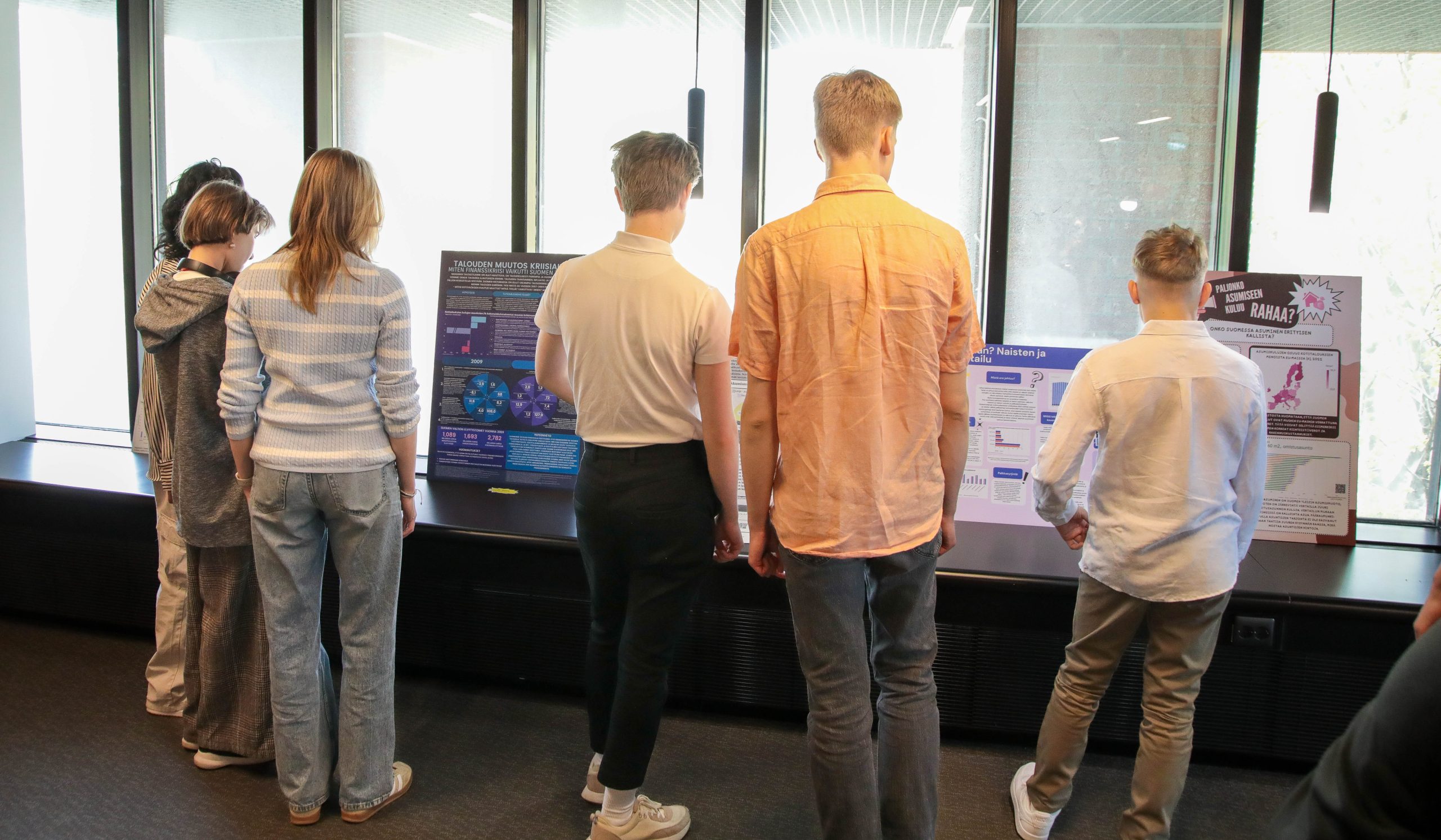 Nuoria tutkimassa tilastoaiheisia kilpailutöitä tilastokilpailujen palkintogaalassa. Kuva: Aki Harju
