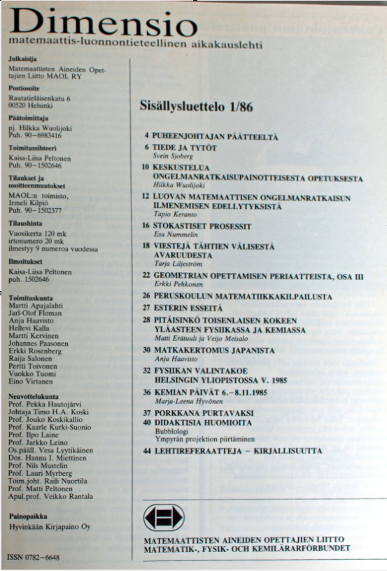 Dimension toimitussihteerinä aloitti vuonna 1985 Kaisa-Liisa Peltonen, joka hoiti Dimension taittamisen ja oikoluvun, vastaavasti Dimension päätoimittajana vuonna 1986 oli MAOLin puheenjohtaja Hilkka Vuolijoki. Vuonna 1986 Dimensio ilmestyi 9 numeroa vuodessa ja yhteensä artikkeleita julkaistiin 162 kappaletta. Vasta vuonna 1994, kun Pentti Parviainen aloitti MAOLin puheenjohtajana, siirryttiin julkaisemaan Dimensiota 6 numeroa vuodessa. Dimension ensimmäisessä numerossa (1/1986), joka oli 48 sivun pituinen, Hilkka Vuolijoki pohti ylioppilaskirjoituksia, joita käytännössä oltiin uudistamassa työryhmän ehdotusten pohjalta. Hilkka toi esille MAOLin kannan eli matematiikan pakollisuuden ylioppilaskirjoituksissa. Jälkiviisaana voi sanoa, että tässä on käynyt toisin eli vain äidinkielen ja kirjallisuuden koe on jäänyt pakolliseksi.