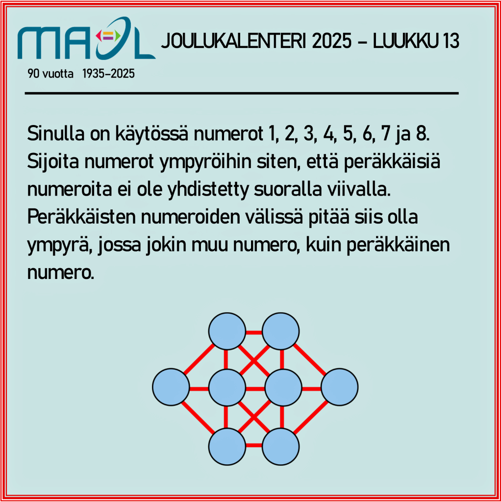Julkaisemme joulukuussa joka päivä jouluaattoon asti uuden tehtävän pohdittavaksi. Ratkaisut löytyvät MAOLin sivuilta (jäsenille). Hyvää joulun odotusta!