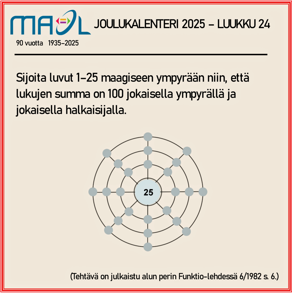 Julkaisemme joulukuussa joka päivä jouluaattoon asti uuden tehtävän pohdittavaksi. Ratkaisut löytyvät MAOLin sivuilta (jäsenille). Hyvää joulun odotusta!