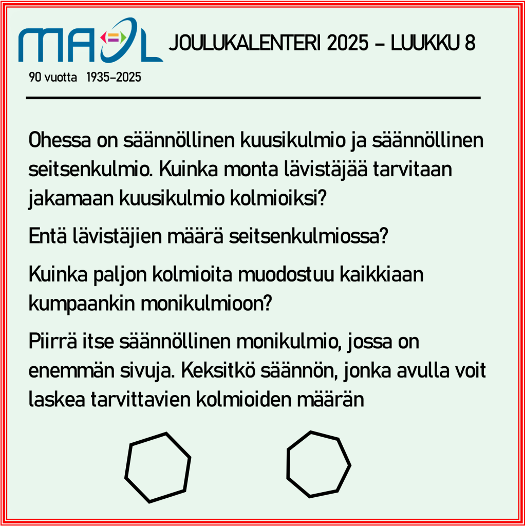 Julkaisemme joulukuussa joka päivä jouluaattoon asti uuden tehtävän pohdittavaksi. Ratkaisut löytyvät MAOLin sivuilta (jäsenille). Hyvää joulun odotusta!