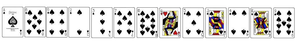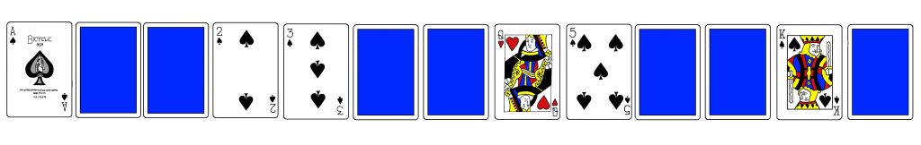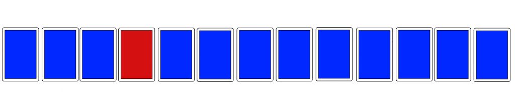 Seuraava mukaelma on rakentamani. Idea on sama. Pöydällä on kortteja, tällä kertaa kolmetoista. Osa korteista on kuvapuoli ylöspäin ja osa kuvapuoli alaspäin. Esimerkissämme tilanne näyttää tällaiselta: