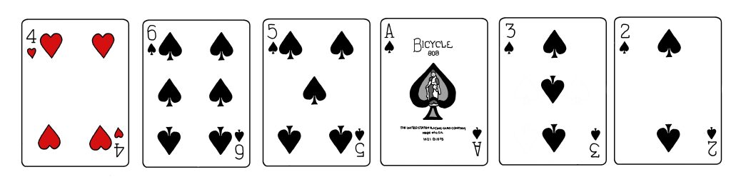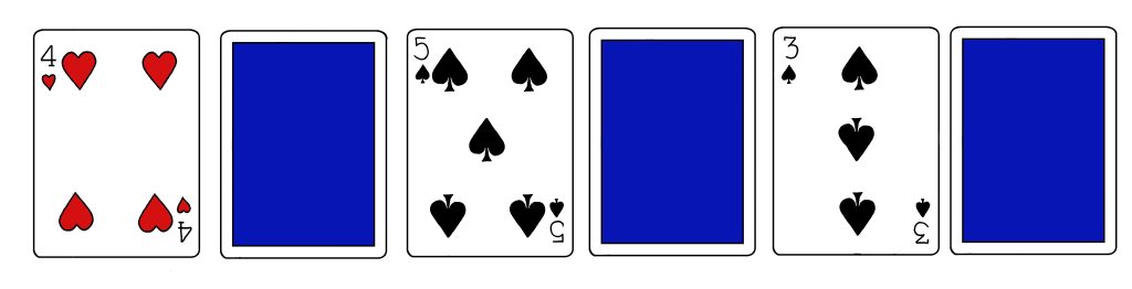 Taikuri jakaa pöydälle kuusi pelikorttia. Osa korteista on kuvapuoli ylöspäin ja osa kuvapuoli alaspäin.