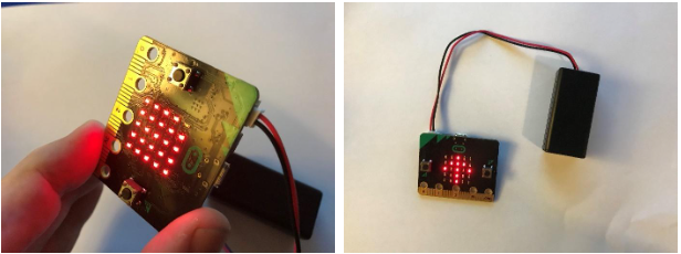 Kun kopioit koodin Micro:bitiin, laite pitää olla kytkettynä esimerkiksi USB-portin kautta tietokoneeseen tai ChromeBookiin. Jos olet muodostanut laiteparin Micro:bitin ja tietokoneen välillä, niin koodi tallentuu automaattisesti Micro:bitille, kun painat Lataa-painiketta. Mikäli laiteparia ei ole muodostettu, niin hex-tiedosto tallentuu Ladatut tiedostot -kansioon, josta se pitää edelleen kopioida Micro:bitille. Kun olet saanut siirrettyä koodin Micro:bittiin, se tallentuu sinne, kunnes se korvataan uudella koodilla eli voit irrottaa Micro:bitin tietokoneesta ja laittaa siihen kiinni paristokotelon, kuten kuvassa 2. Paina nyt A-painiketta Micro:bitissä, jolloin kalibrointi alkaa. Kalibroi kompassi kääntelemällä Micro:bitiä joka suuntaan, kunnes kaikki 25 LED-valoa palavat. Kalibroinnin voi tarvittaessa aloittaa alusta painamalla A-painiketta. Kun kalibrointi on onnistunut, näet nuolet osoittavan johonkin suuntaan. Käännä Micro:bitiä sivusuunnassa, kunnes nuoli osoittaa ylös eli pohjoiseen.