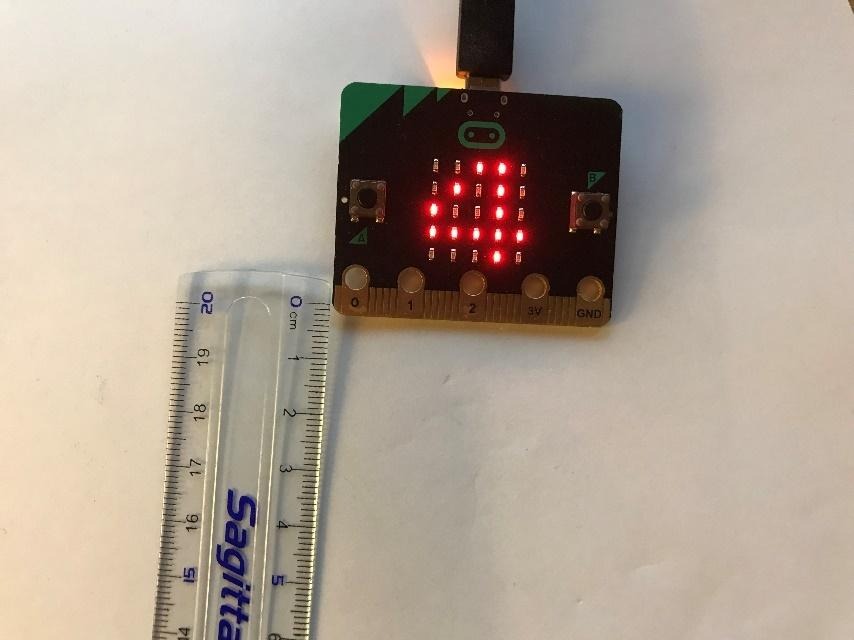 Seuraavaksi kopioi koodi Micro:bitiin ja laita Micro:bitin viereen viivoitin, kuten kuvassa 4. Nyt laita voimakas magneetti sentin päähän Micro:bitistä ja ota lukema ylös. Siirrä kahden sentin päähän ja ota lukema ylös. Jatka näin, kunnes lukema ei enää muutu. Miksi lukema ei mene nollaan? Koska jäljellä oleva lukema kuvaa maan magneettikenttää, joka ei tietenkään ole nolla. Voit tehdä havaintoarvoista xy-kuvaajan, kuten kuvassa 5 on esitetty. Miksi ei synny suoraa viivaa? Selitys on yksinkertainen: magneettikenttä pienenee neljäsosaan, kun matka kaksinkertaistuu eli voimassa on ns. käänteisen neliön laki. Sinun kuvaajasi voi poiketa paljonkin minun kuvaajastani, koska se on riippuvainen magneetin voimakkuudesta. Kannattaa myös muistaa, että lähellä olevat rautaesineet sotkevat helposti mittausta. Mutta magneettikentän voimakkuus putoaa nopeasti alas matkan kasvaessa, mikä havaitaan myös mittaustuloksista.