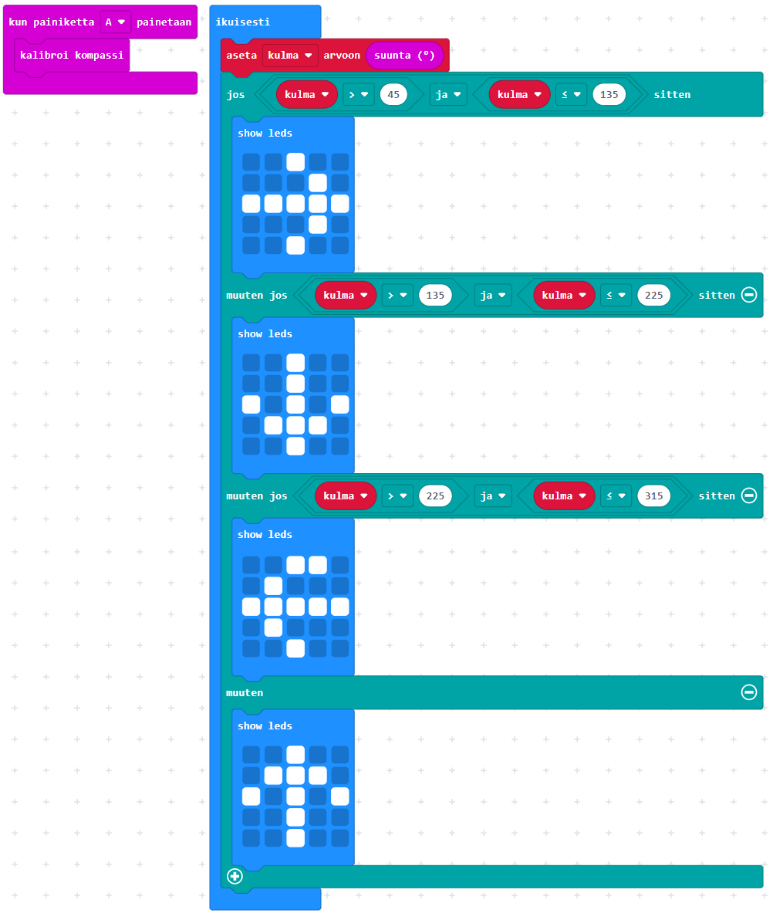 Micro:bit osaa mitata maan magneettikentän suunnan asteina. 0° tai 360° on pohjoinen, 90° on itä, 180° on etelä ja 270° on länsi. Ennen kuin magneettikentän suunnan mittaus onnistuu, kompassi on kalibroitava. Onneksi tähän löytyy Micro:bitistä valmis koodi. Kalibroinnin jälkeen laite ei kerro mitään suunnasta, ellemme sitä erikseen pyydä. Laite siis tarvitsee koodin, jossa laite ensin kalibroidaan ja vasta sitten mitataan magneettikentän suuntaa. Tämä magneettikentän suunta luetaan ikuisessa silmukassa ja tallennetaan ohjelmassa muuttujalle, jonka nimi voi olla esimerkiksi kulma. Tämän jälkeen tarvitsemme ehtolauseita. Esimerkiksi jos kulma on suurempi kuin 45 astetta ja pienempi tai yhtä suuri kuin 135 astetta, niin osoita oikealle eli itään. Jos kulma on suurempi kuin 135 ja pienempi tai yhtä suuri kuin 225 astetta, niin osoita alapäin eli etelään. Jos kulma on suurempi kuin 225 ja pienempi tai yhtä suuri kuin 315, niin osoita vasemmalle eli länteen. Kaikissa muissa tapauksissa osoitetaan ylös eli pohjoiseen. Kompassiohjelma on seuraavanlainen: