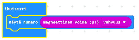 Magneettikentän mittaamiseen tarvittava koodi on lyhyt. Laitetaan ikuisesti-silmukkaan Näytä numero -komento ja sen sisälle toinen komento, joka mittaa magneettikentän voimakkuuden. Tarvittava koodi on esitetty kuvassa 3.