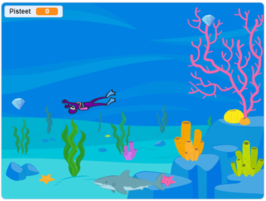 Käynnistetään seuraavaksi Scratch-ohjelma, lisätään sinne pelihahmot ja taustakuva Scratchin vakiokirjastosta sekä lisätään sinne muuttuja: Pisteet. Mitä tehdään seuraavaksi? Vuorossa on algoritmin eli sanallisen ohjeen laatiminen siihen, kuinka sukeltaja, hai tai timantit käytännössä saadaan liikkumaan. Kun idea on selvillä, se pitää testata koodaamalla ja ajamalla koodi ohjelmointiympäristössä.