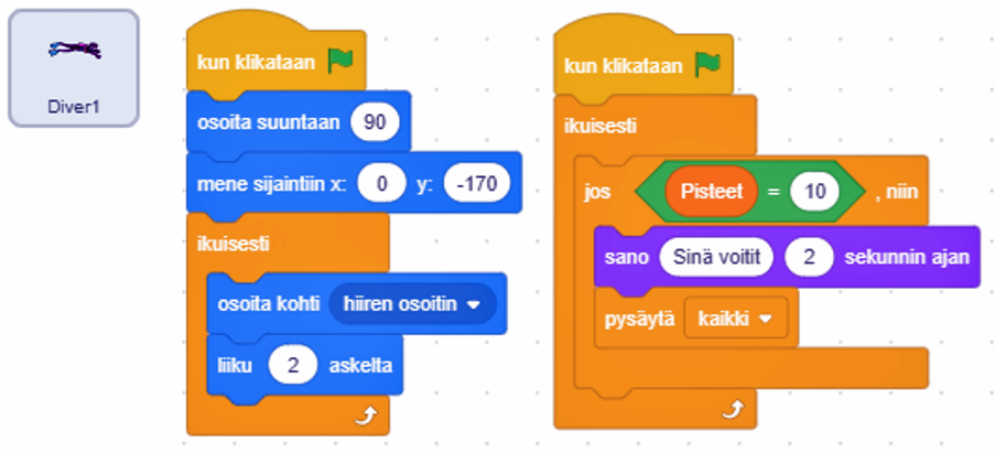 Scratchissä on käytössä xy-koordinaatisto, jossa ikkunan keskellä on koordinaattipiste (0,0). Koordinaatisto on sama kuin matematiikassakin. Kun mennään oikealle, silloin x:n arvot kasvavat, ja vastaavasti kun mennään vasemmalle, silloin x:n arvot vähenevät. Kun mennään ylös, silloin y:n arvot kasvavat, ja vastaavasti kun mennään alas, silloin y:n arvot vähenevät. Suunta oikealle on 90 astetta ja vasemmalle –90 astetta, vastaavasti suunta ylös on 0 astetta ja alas 180 astetta (tai –180°). Scratchistä löytyvät valmiit komennot hahmon laittamiseksi tiettyyn paikkaan ja liikkumiseen tässä koordinaatistossa. Kaikki komennot alkavat aloituskomennolla, joka on tässä tapauksessa vihreä lippu. Sukeltajan algoritmi on yksikertaisuudessaan seuraava: Asetetaan sukeltaja ikkunassa keskelle alas eli paikkaan x = 0 ja y = -170 ja suunta on oikealle eli itään päin (90°). Kun laitamme ikuisen silmukan sisälle komennot, jossa hahmo osoittaa kohti hiiren osoitinta ja samalla liikkuu eteenpäin, esimerkiksi 2 askelta, niin sukeltajaa voidaan ohjata hiiren avulla. Luodaan samalla toinen ehto. Jos Pisteet-muuttuja saa arvon 10, silloin ilmoitetaan, että olet voittanut pelin ja peli päättyy. Tämä komento on laitettava ikuisen silmukan sisälle, koska muuten tarkistus tehtäisiin vain kerran. Katso koodin toteutus kuvasta 2.