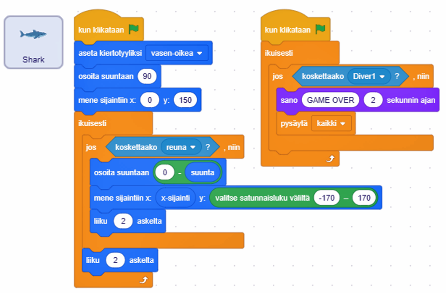 Samalla tavalla hai voidaan asettaa tiettyyn alkupaikkaan (x = 0, y = 150) xy-koordinaatistossa. Hai saadaan liikkumaan esimerkiksi 2 askelta haluttuun suuntaan, kun laitetaan tämä komento ikuisesti silmukan sisälle. Mutta mitä tehdään sitten kun hai törmää ikkunan reunaan? Hain pitäisi silloin muuttaa suuntaa. Suunnan muuttaminen tarkoittaa sitä, että suunnan etumerkki muutetaan päinvastaiseksi eli vastaluvuksi, koska oikealle suunta on 90 astetta ja vasemmalle suunta on –90 astetta. Tarvitsemme siis ohjelmaan ehdon, että jos hai koskettaa reunaa, niin muuta suunnan etumerkki. Kun suunta on muutettu, voidaan arpoa uusi satunnainen paikka pystysuunnassa ja liikkua hieman eteenpäin, jotta emme kosketa enää reunaa. Tämä toteutus on esitetty kuvassa 3. Samalla lisätään vielä toinen komento, jossa ikuisen silmukan sisällä tehdään tarkistus: Jos hai koskettaa sukeltajaa, niin peli päättyy siihen.