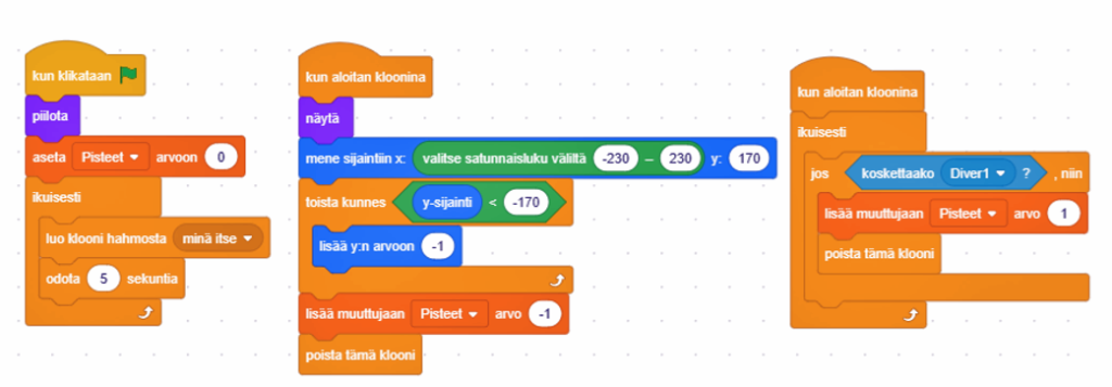 Nyt tarvitsee enää lisätä koodi timantille. Kuinka yhdestä timantista saadaan useampi timantti? Se onnistuu kloonaamalla timanttia, ja tälle toiminnolle on Scratchissä jo valmiina omat komennot. Luodaan siis koodi, jossa piilotamme alkuperäisen timantin näkyvistä ja teemme siitä joka 5 sekunnin välein uuden kloonin. Kun klooni on luotu, tuomme sen näkyväksi ja asetamme sen ikkunan yläreunaan (y = 170) satunnaiseen vaakapaikkaan. Kun pienennämme silmukan sisällä tämän kloonitimantin y arvoa, niin kloonitimantti tippuu alapäin. Kloonitimantti voidaan poistaa kahdella tavalla. Jos timantti on päässyt ikkunan alareunaan (y on pienempi kuin -170) tai kloonitimantti koskettaa sukeltajaa. Jos kloonitimantti on alareunassa, silloin vähennetään piste. Jos kloonitimantti koskettaa sukeltajaa, silloin annetaan piste. Tämän idean toteutus on esitetty kuvassa 4.