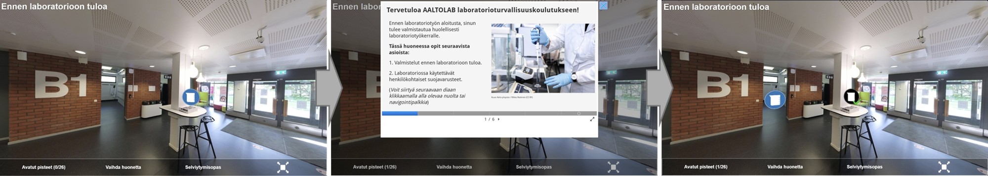 Virtuaalilaboratoriot ovat 360°-oppimisympäristöjä, jotka koostuvat oikeiden laboratorioympäristöjen 360°-panoraamakuvista (kuva 1). Näiden panoraamakuvien sisällä on oppimateriaaleja, jotka sisältävät tekstiä, kuvia, videoita sekä interaktiivisia elementtejä kuten harjoitustehtäviä videossa tai erillisenä osana (kuva 2). Virtuaalilaboratorio ei tarvitse erillisiä virtuaalitodellisuuslaitteita vaan niitä voi käyttää tavallisella tietokoneella tai tabletilla.