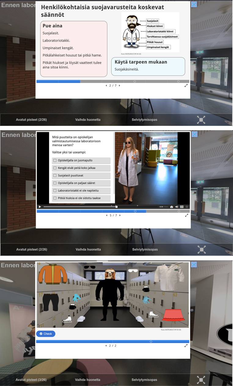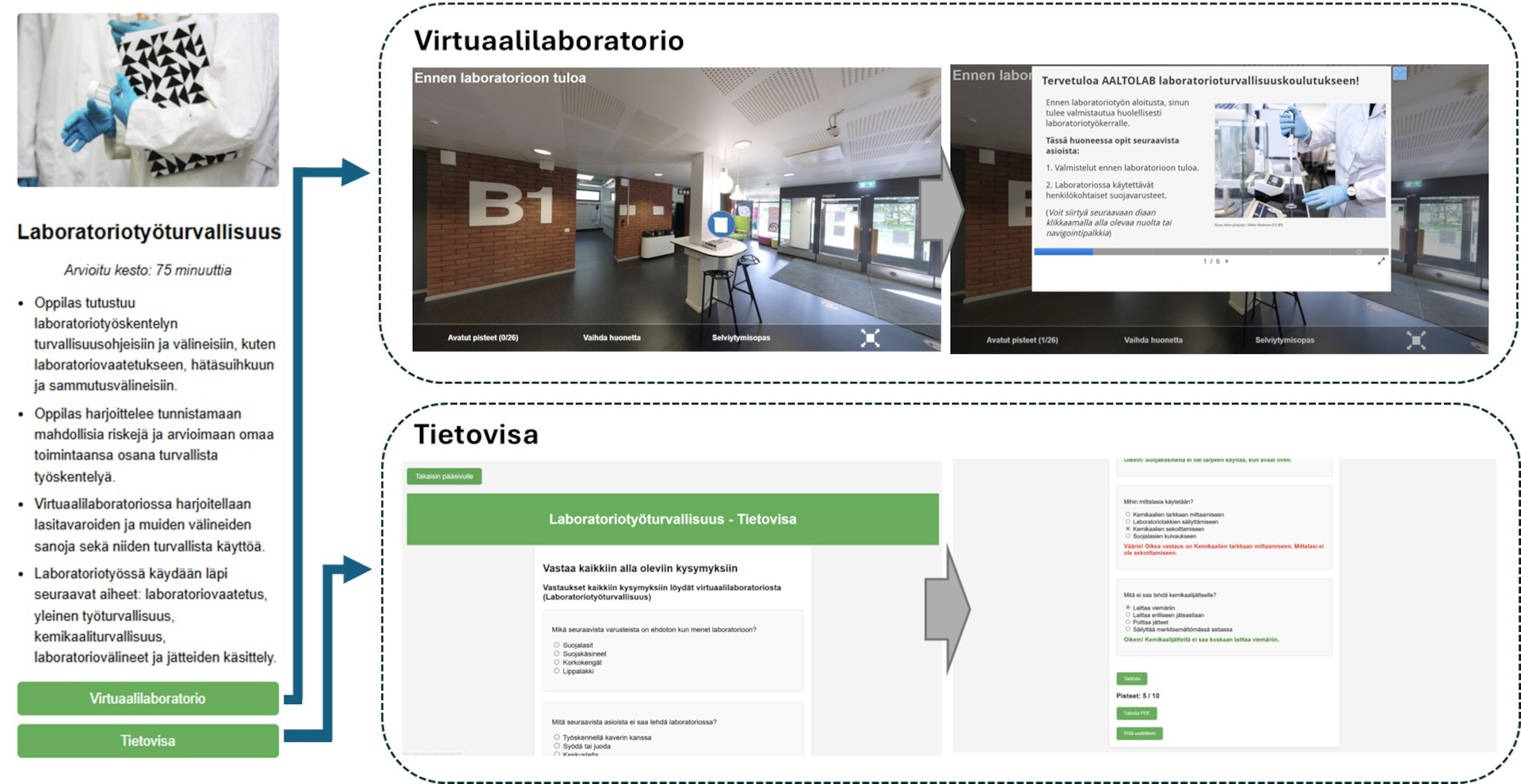 Kuva 3. Esimerkki laboratoriotyöturvallisuus-virtuaalilaboratoriokokonaisuudesta, joka koostuu virtuaalilaboratoriosta sekä tietovisasta. (Kuva: Samuel Girmay)