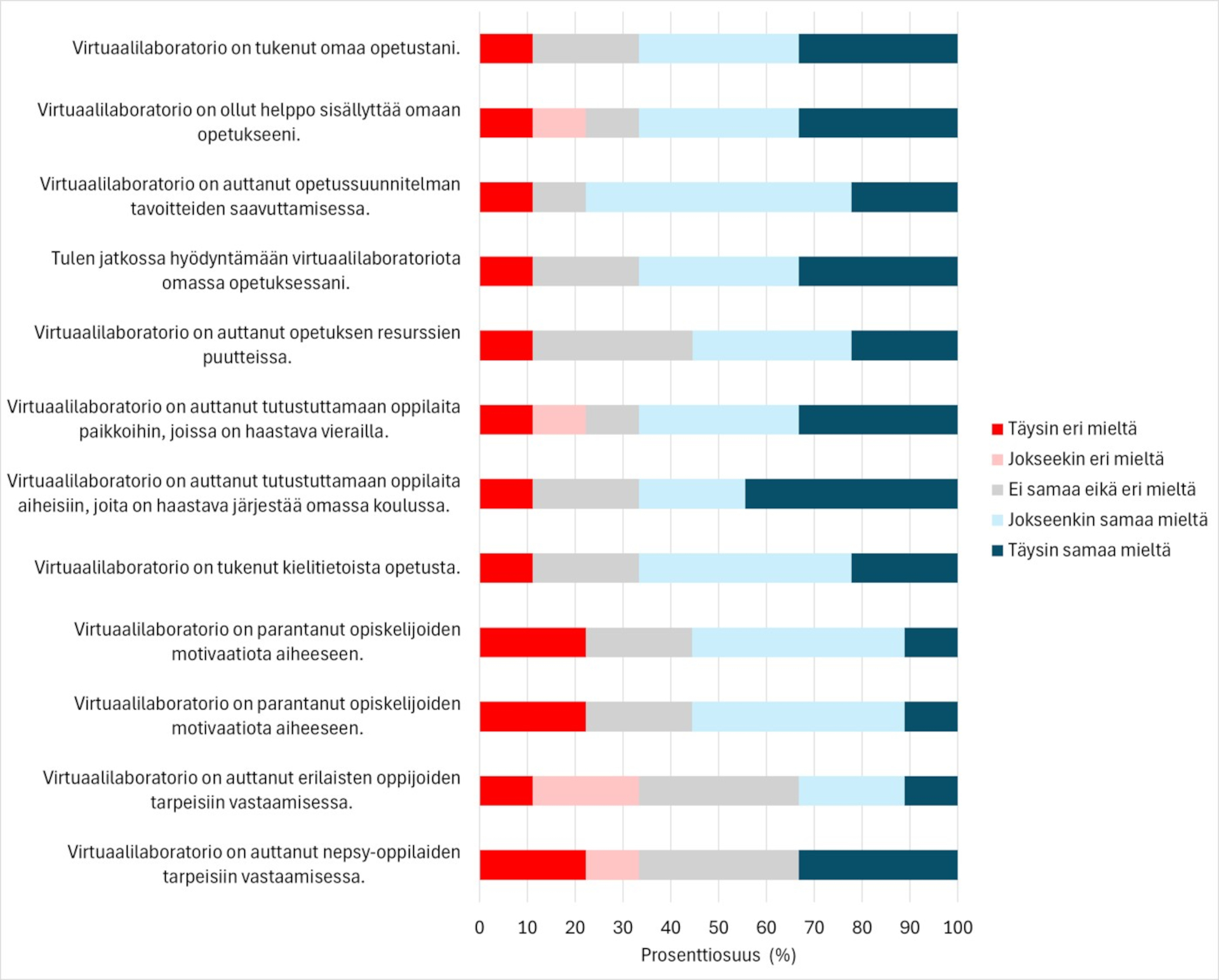 Sen sijaan vaikutus opetuksen aikataulupaineisiin arvioitiin neutraalimmaksi. Tässä voi syy löytyä siitä, että vaikka virtuaalilaboratoriot voivat helpottaa opetuksen järjestämistä, niiden käyttöönotto ja pedagoginen suunnittelu vaativat aluksi aikaa. Toisaalta virtuaalilaboratoriot voivat vähentää tarvetta järjestää erillisiä vierailuja tai valmistella vaativia laboratoriotöitä, mikä voi helpottaa aikataulutuksessa.