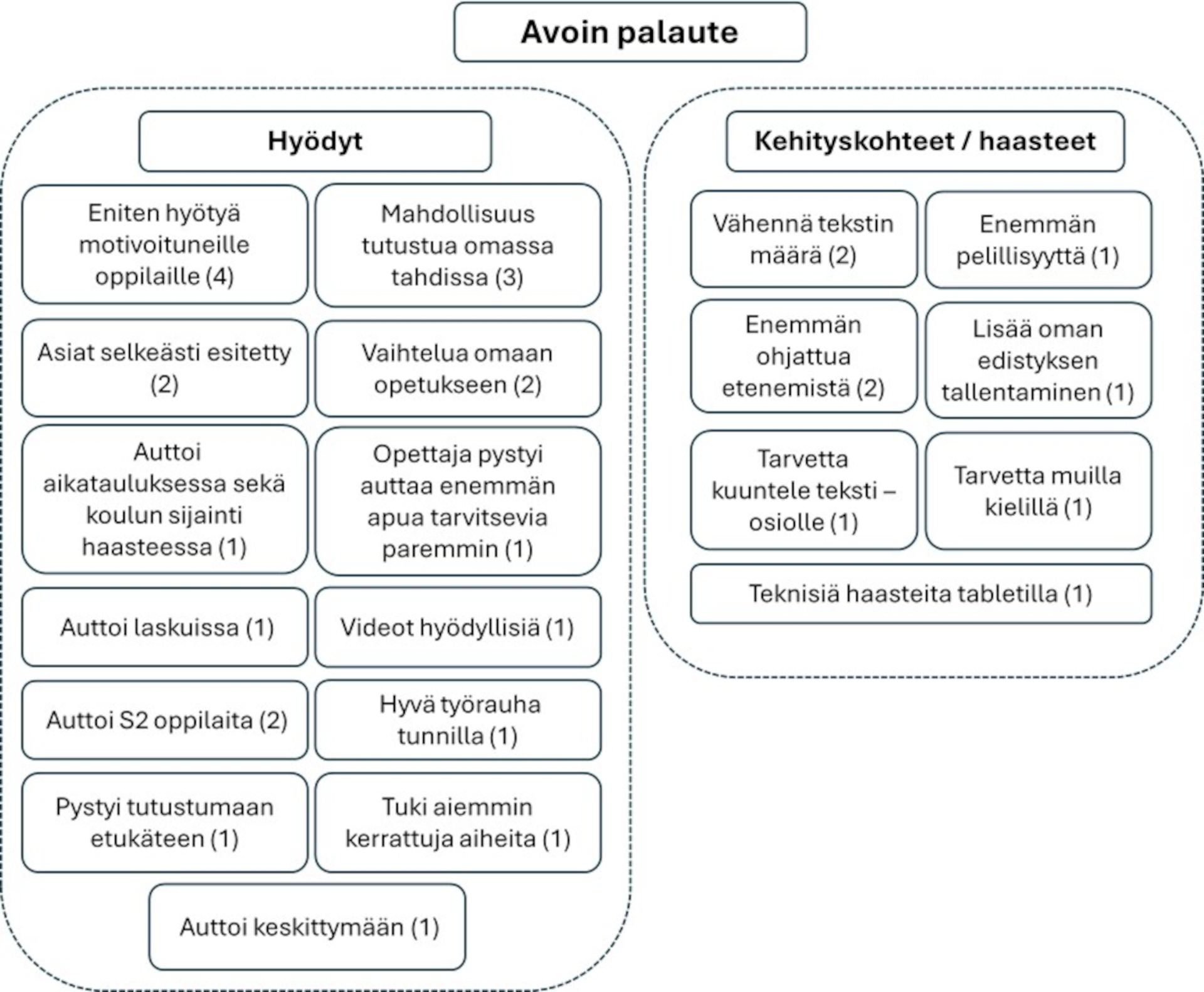 Kuva 5. Avoimesta palautteesta löytyneet teemat (N = 9). Sulkeissa esitetty numero ilmaisee, kuinka moni opettaja mainitsi kyseisen teeman palautteessaan. (Kuva: Samuel Girmay)
